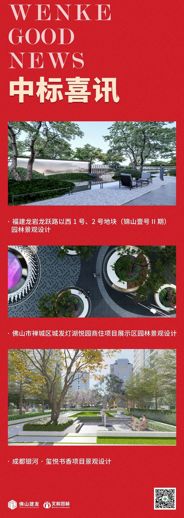 捷报频传!402永利集团官网入口园林接连中标“福建龙岩龙跃路以西1号、2号地块(锦山壹号II期)园林景观设计、佛山市禅城区城发灯湖悦园商住项目展示区园林景观设计、成都银河·玺悦书香项目景观设计”项目。402永利集团官网入口始终坚持以人为本的设计理念,打造高品质美好人居生活环境,未来将持续助力绿色宜居人文城市的发展。