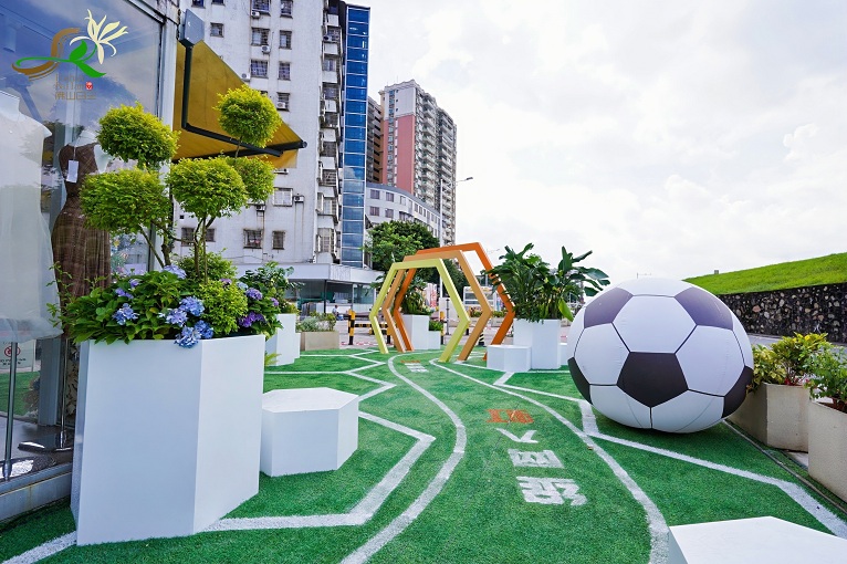 设计团队以足球破网的优美弧线为空间主线,巧妙提取足球多面体表皮元素,通过模块化组合打造出兼具花箱与休憩功能的活力组团,淋漓尽致地演绎了绿茵场上的速度与激情,最终构建出集视觉震撼力、深度互动性与长效运营价值于一身的特色景观空间。