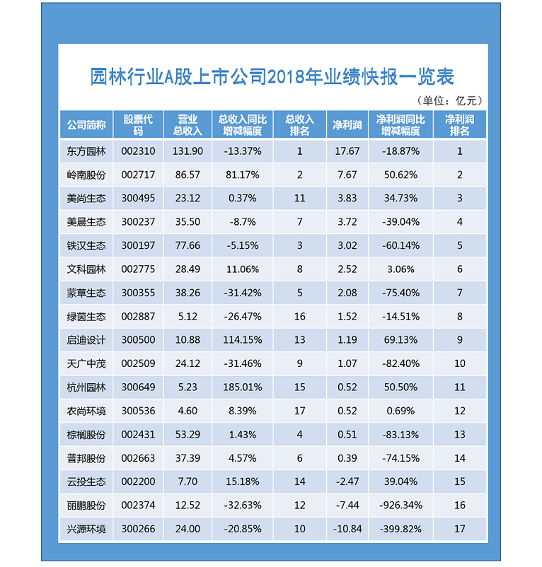 近期,A股园林行业的大部分上市公司相继公布了2018年度业绩快报。我们对已公布快报的公司进行了业绩数据整理,以帮助大家更全面地了解过去一年的行业发展情况。